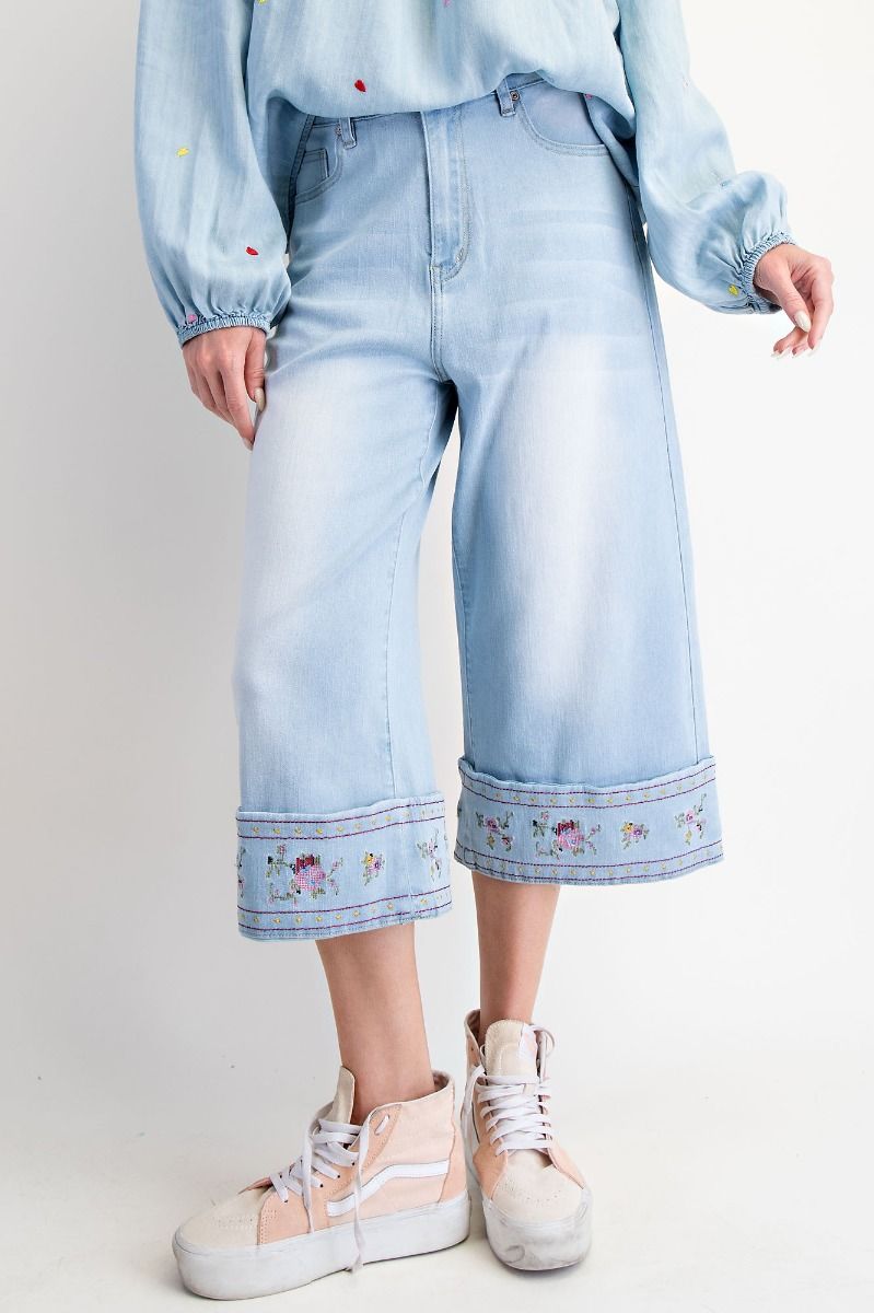 Embroidered Cropped Pants in Washed Denim