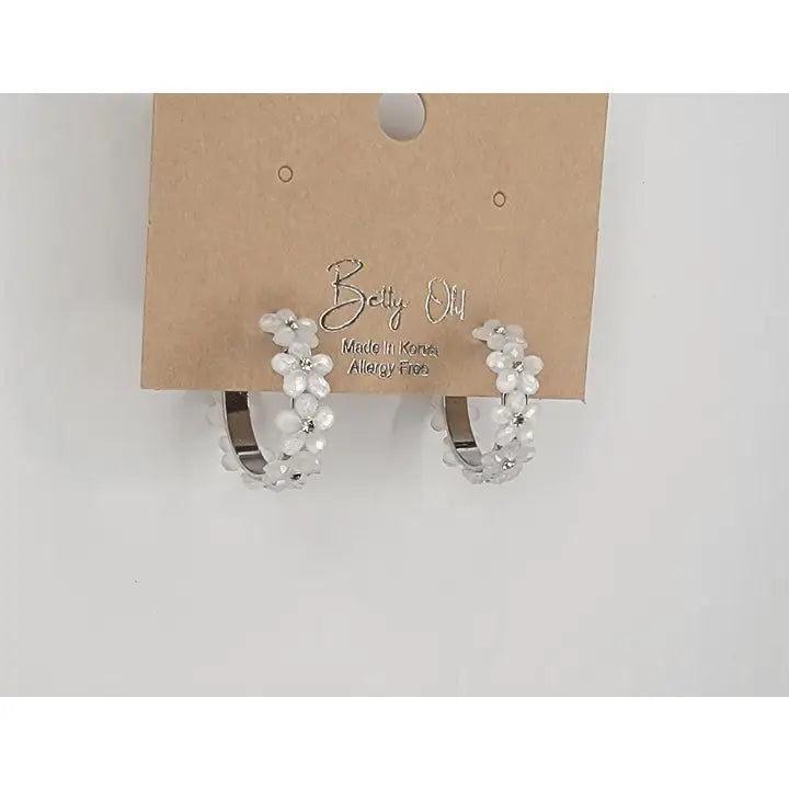 Pair of hoop earrings with floral designs on a Betty Oh branded card against a white background