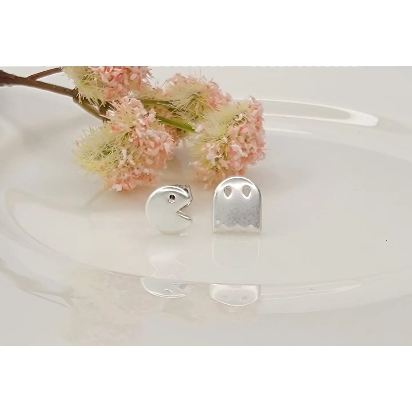 Silver stud earrings of retro arcade game character and ghost enemy.