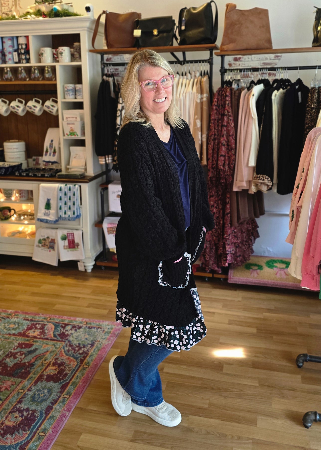 Woman wearing a black cardigan with floral trim, white top, and blue jeans against a gray background