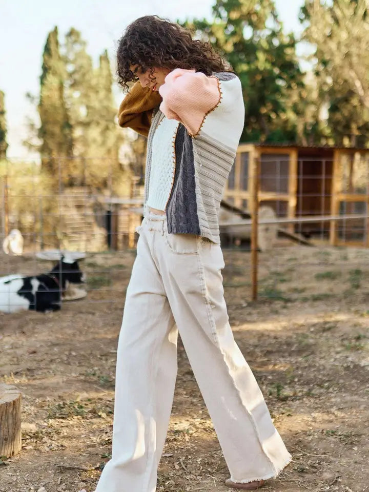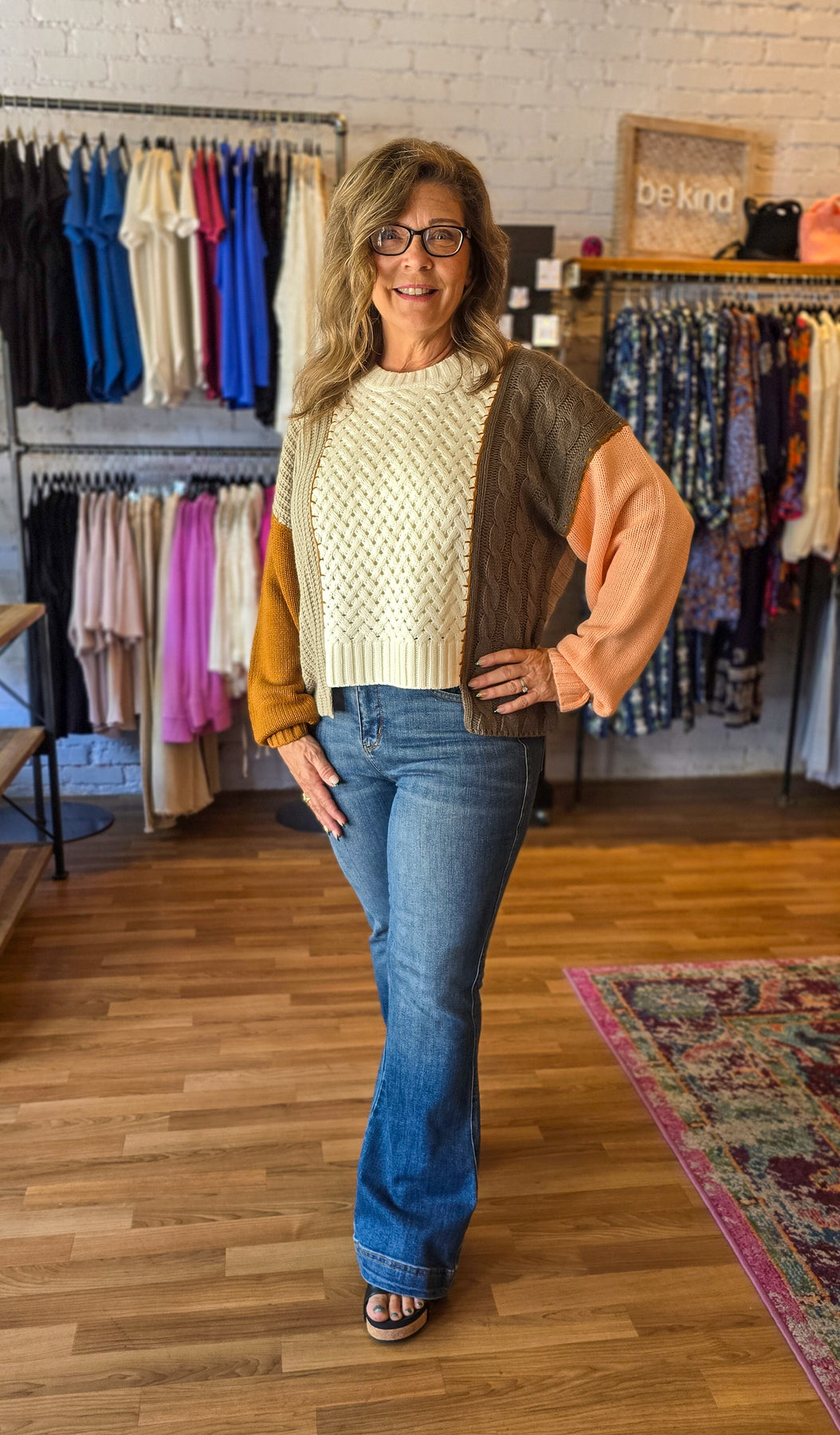 Add a little playful charm to your everyday style with this cozy patchwork Colorblock sweater. Designed with a mix of textures and shades—warm caramel, soft blush, creamy ivory, and deep charcoal—it’s a statement piece that feels effortlessly unique.